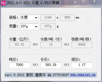 1楼 华军网友 2015-03-14 00:51:55纸张价格数量换算器很好用,谢谢啦!!