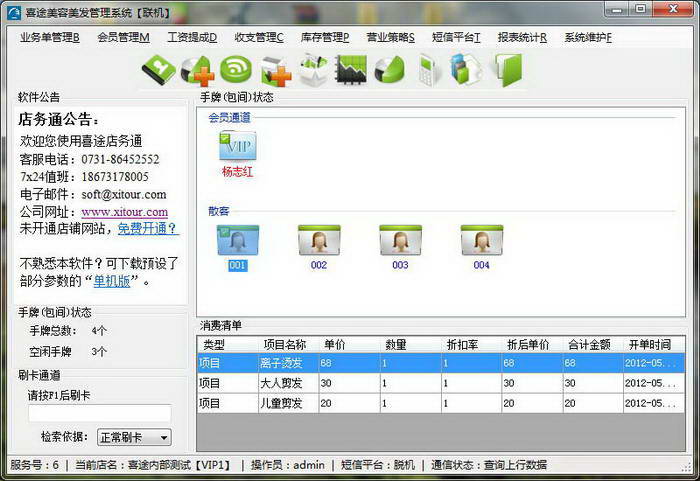 6、集成短信互动:群发各类短信,生日短信、消费提示、余额提示。软件内置大量的短信模板。发送短信无需任何设置只要求可以上网。