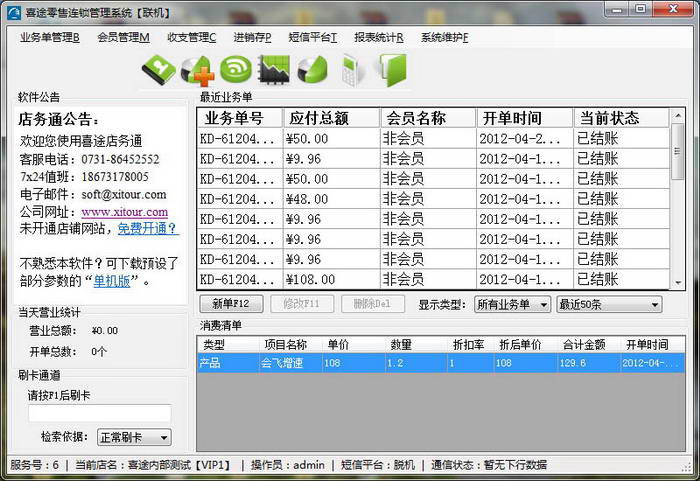 7、集成短信互动:群发各类短信,生日短信、消费提示、余额提示。软件内置大量的短信模板。发送短信无需任何设置只要求可以上网。