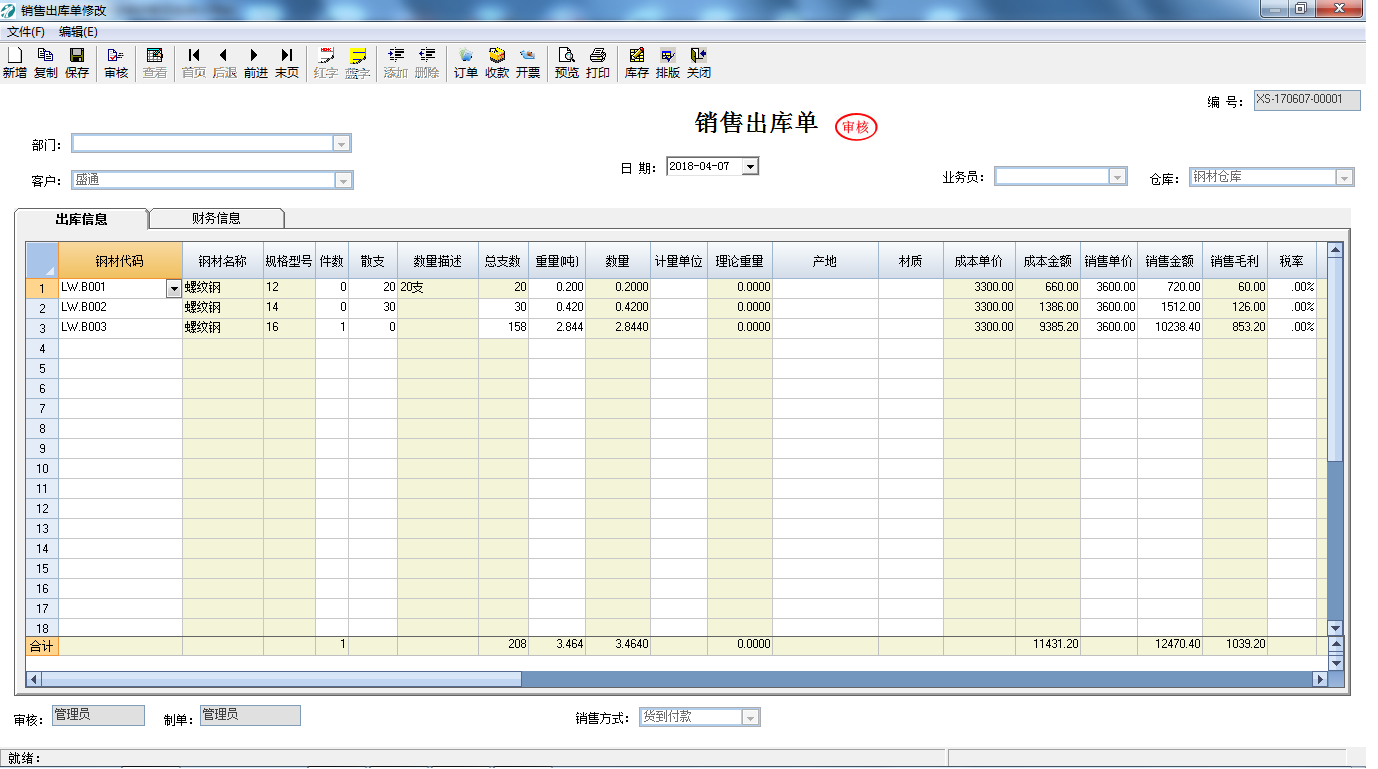 由销售订单、销售出库单(退货)和收款单(预收)三个功能模块组成,可以详细地统计销售订单发货情况、客户销售统计、钢材销售统计、自动计算销售毛利、客户应收款、客户往来对账、利润表、销售收款统计、业务员应收款等。