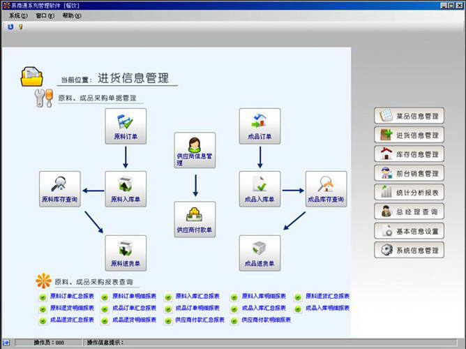 2、软件包含餐饮行业的绝大部分常用功能:进货、退货、领用、退库、报损、盘点、前台收银、会员管理、查询统计等。