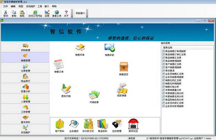 智信车辆维修管理软件是专门针对车辆维修行业开发的进销存管理软件,跟一般的通用进销存软件相比,在功能上更符合车辆维修的行业特点,既有进销存管理,又有人事工资管理模块。在操作上更加简单快捷,极易上手。,适合汽配批发零售企业或部门(如汽配城经销商、品牌专卖店、特许连锁经营店等)本软件专为汽配经销企业的进销存业务管理所开发,软件包括:客户管理、供应商管理、采购管理、销售管理、仓库管理、账款管理和统计分析等,智能化财务管理,应收应付账款、资金流动情况、公司费用支出等,老板无须财务专业知识就可以管账理财,轻松了解企业经营情况;智信车辆维修管理软件软件功能: