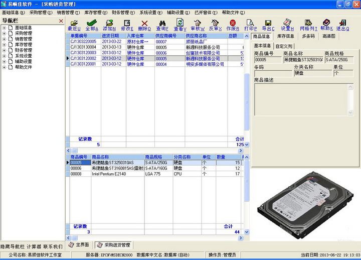3、采购管理:提供从采购申请、采购订单、采购进货、采购退货、采购换货与采购付款的完善采购流程管理。开采购订单/采购进货/采购退货/采购换货单据时,可以直接同时完成付款操作,大大方便使用软件。可根据库存缺货报警等信息直接生成相应的采购单据,也可批量导入单据,加快开单速度。提供丰富的采购申请/订单/进货/退货/换货明细表与汇总表,采购计划分析表,采购价格分析表,商品历史价格表,帮助企业实现采购物流、资金流和信息流的有效管理。