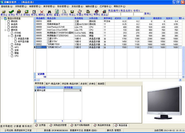 2、基础信息:提供多项基本的信息设置,包括:人员信息/部门信息/往来单位信息/地区信息/行业信息/结帐方式/币别与汇率/往来单位来源/往来单位分类/商品信息/商品分类信息/商品单位信息/条码信息/仓库信息/支付方式/帐户信息等信息。部门信息/地区信息/行业信息/往来单位分类/商品分类信息等按树型结构进行分类管理,让您以后可以按大小类进行数据查询分析。在商品信息界面中可以同时录入商品对应的多个客户与供应商,让您随时可以查询出每种商品的详细客户与供应商,不同的客户/供应商可以设置不同的交易单位/单价/料号。强大的商品图片管理功能,一个商品可以存放1张默认图与18张高清图,可以设置图片存放在本机上,还是数据库上,还是存放图片面性网址,导出Excel时,支持连商品图片也一起导出到Excel里面。直接可以在商品信息中查看每种商品在每一个仓库的详细数量。人员/往来单位(包括供应商、客户、会员等)/商品信息的批量数据导入功能,让您一次性完成前期数据的建立。人员分部门,往来单位(包括供应商、客户、会员等)分行业分地区,商品分类管理,让您更加方便进行人员/往来单位(包括供应商、客户、会员等)/商品信息管理。