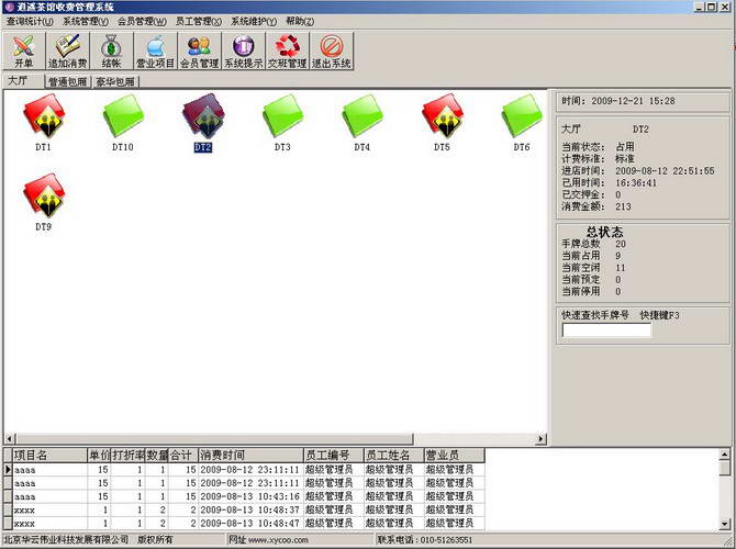 点单消费→增加消费:客人在消费过程中所消费的所有项目均要进行入帐处理,以便在客人离店时自动计算消费额。客人的消费明细便是在此入帐。