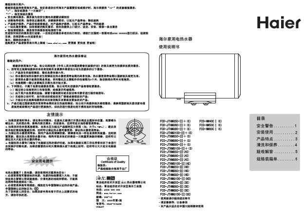 海尔 A8储热式电50升热水器 FCD-JTHMG50-III+(E) 说明书