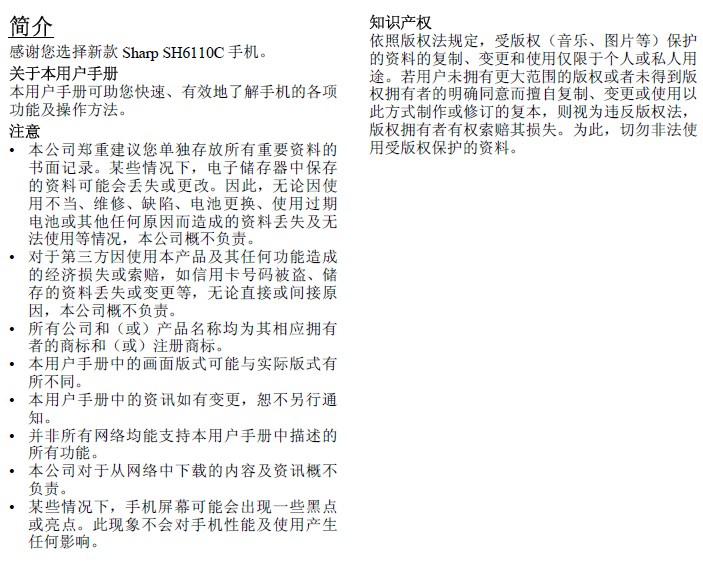 SHARP夏普SH6110C手机简体中文版说明书评论