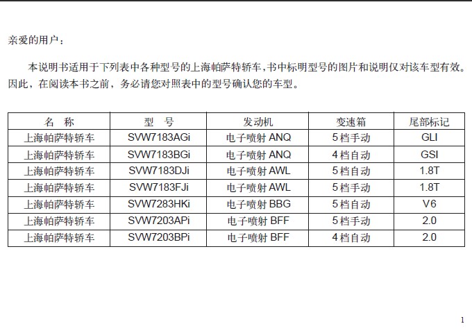 大众PASSAT帕萨特 SVW7183FJi 轿车说明书