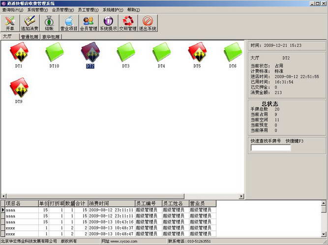 点单消费→增加消费:客人在消费过程中所消费的所有项目均要进行入帐处理,以便在客人离店时自动计算消费额。客人的消费明细便是在此入帐。