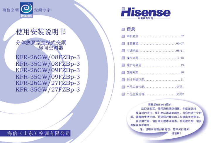 海信 KFR-26GW/27FZBp-3型空调 说明书