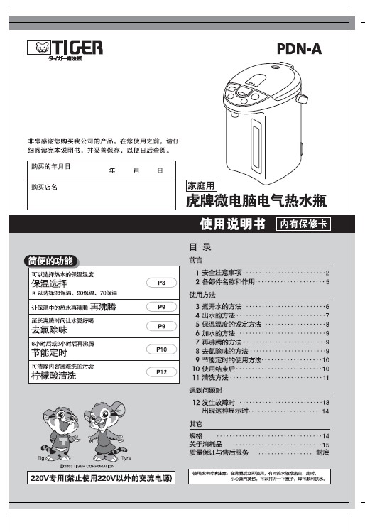 虎牌 PDN-A40C(家庭用)微电脑热水瓶 使用说明书
