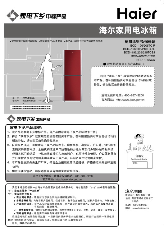 海尔 BCD-206TCZL电冰箱 使用说明书
