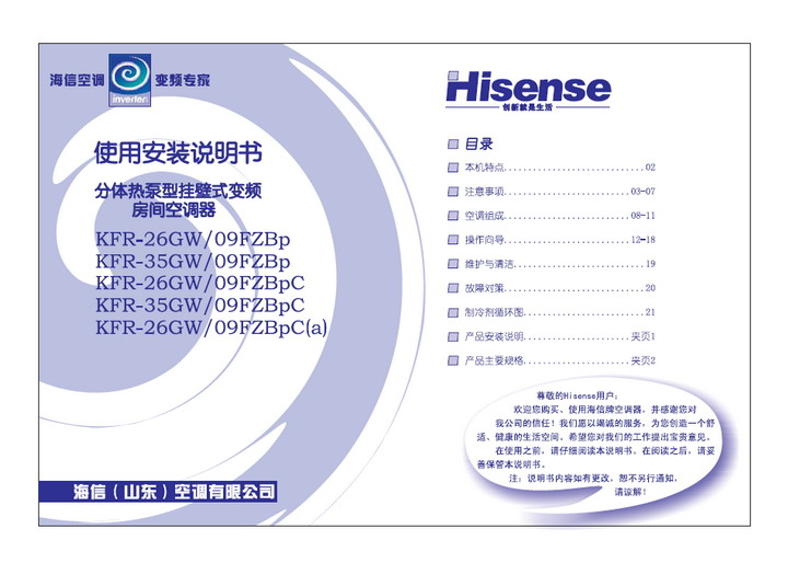 海信 分体挂壁式空调KFR-26GW/09FZBpC型 使用说明书