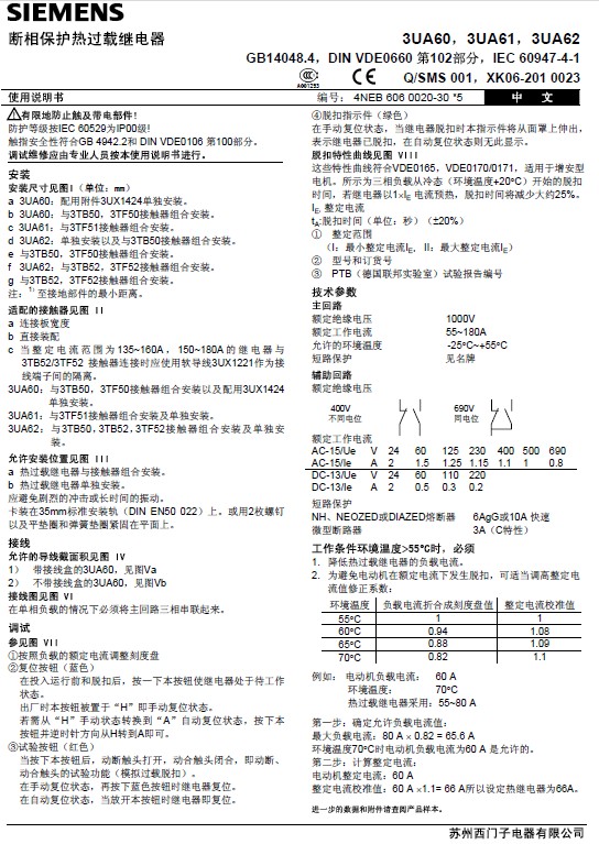 西门子断相保护热过载继电器 3UA60 说明书评论