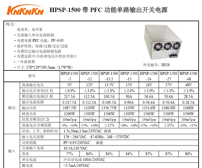 KNKNKN HPSP-1500带PFC功能单路输出开关电源说明书评论
