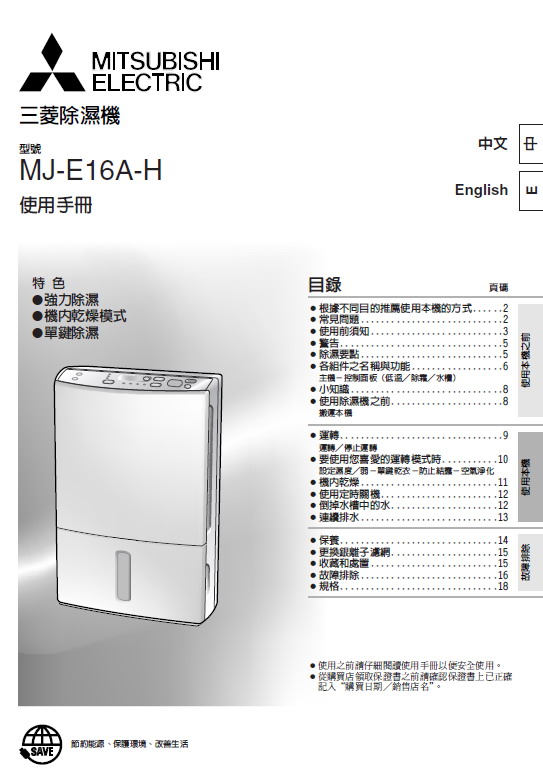 1楼 华军网友 2018-03-25 01:29:06三菱 MJ-E16A-H除湿机 说明书很好用,谢谢啦!!