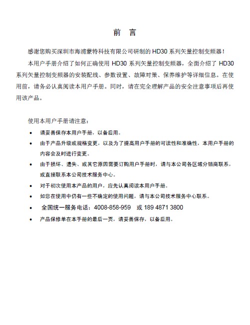 海浦蒙特 HD30-4T220P矢量控制变频器 用户手册