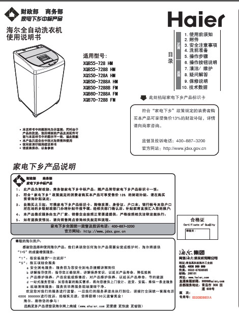 海尔 XQB70-7288 HM全自动洗衣机 使用说明书