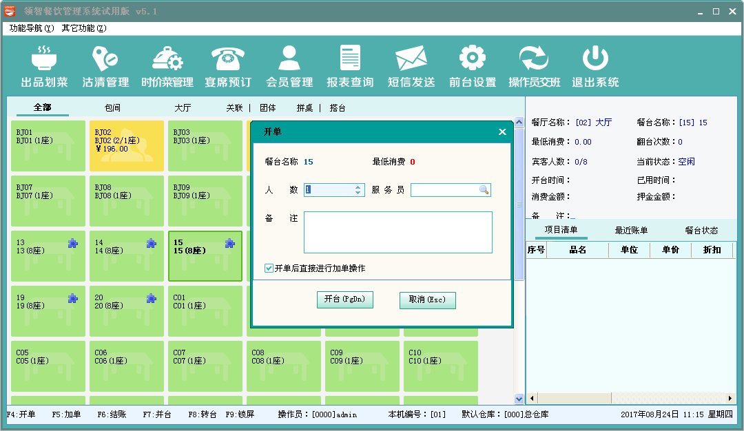 (1) 宾客开台:支持普通宾客开台,并为餐台指定值台服务生以及宾客人数。