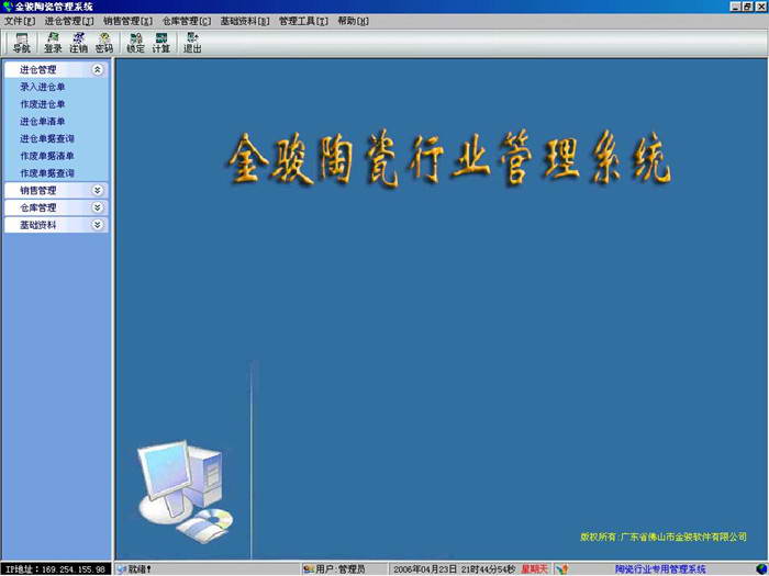 适合陶瓷集团公司及大中小陶瓷企业应用。 基础资料均提供导入与导出功能、数据库备份与恢复、数据清空功能、并提供软件程序自动升级功能,还可将所有单据导出Excel。软件强大通用性、界面友好、操作简便、功能实用。默认用户:Admin 密码:000 ·默认连接本身自带的数据库(Sybase) ·也可以连接MicroSoft SQL SERVER 2000 ·还可以配置为局域网版,或远程版本。