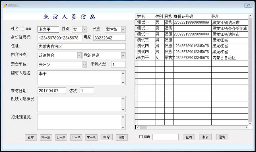 录入模块是根据实际工作进行的设计,十分简便自动。录入时如有重名自动提示是否重访,并提取原数据,由操作者选择是或否再进行下一步编辑;身份证号码项则自动判断校验;可以连接居民身份证阅读机具,直接读取身份证信息。可上传附件文档以备查;在单位局域网中进行协同工作。