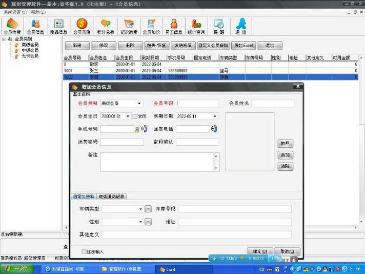 第九节、 会员信息:点击工具栏会员信息,在弹出会员信息管理对话框里可以增加会员信息、修改会员信息;使用磁卡条码ID卡版的,如果没有读卡设备的可以手动输入卡号+回车(读卡过程其实就是相当于手工输入卡号+回车);卡密码默认:8888。特别提示:修改会员信息时不能修改卡号,发错卡时可以修改会员其他信息发给其他会员。如果发错卡类型可以退卡重新发卡。
