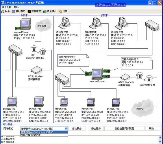 不仅支持ADSL宽带共享, 还支持将局域网内的任何一台电脑作为网关服务器,只要把InernetShare安装在局域网中任意一台可以上网的电脑上, 那么局域网内的其他电脑就可以通过这台电脑共享上网了。