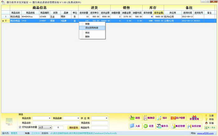 2.主界面可以一目了然的查看到各商品的进销存及利润状况……3.独有的购物袋功能,既可以当作普通销售使用,也可当POS销售来进销售商品(支持各类扫描机扫描销售)。