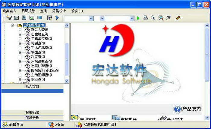 三、查询系统查询系统包括根据入院日期查询,根据出院日期查询,查询简单明了,可进行复合查询,并生成相应报表。充分满足医院查询病案的需要。查询功能模块中,可根据入院日期,出院日期,职业,工作单位,出生地,电话,手术名称,科室,主治医师,等关键字进行查询,并可在查询的结果中进行筛选,排序,做进一步的复合查询,每次查询都有相应的报表,操作简单,功能强大。