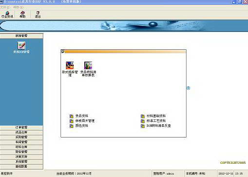 按照业务流程需要,系统主要分为订单管理、排产管理、车间管理、材料管理、成品管理、财务管理、基础资料管理七部分。