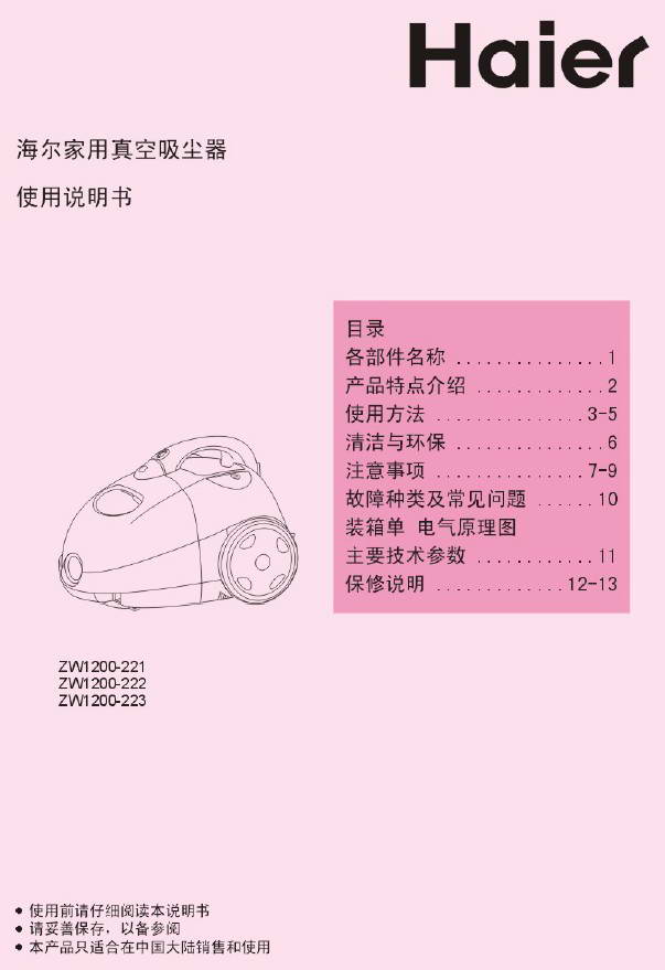 海尔ZW1200-223家用真空吸尘器使用说明书