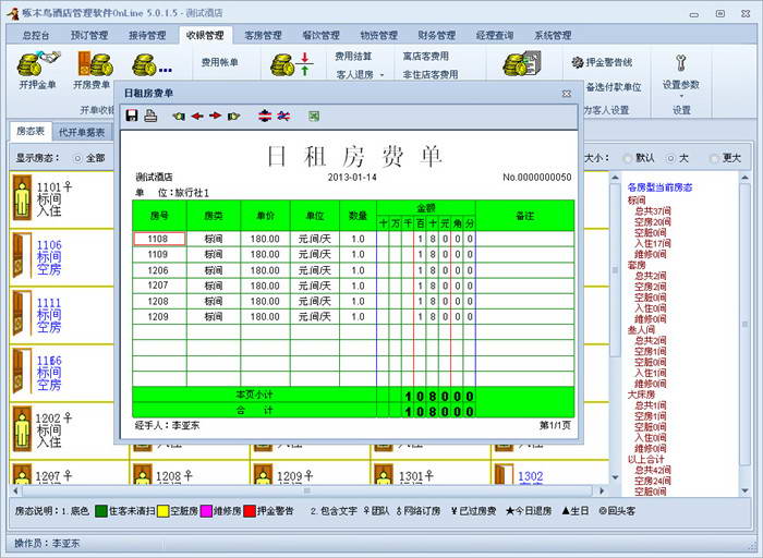 软件功能强大,模块众多,各模块相互独立,可单独使用;相互又巧妙的有所衔接,互为辅助;可同时在多台电脑上协同办公,一台电脑上的信息有了改变,另一台电脑同步刷新;也可以单独只在一台电脑上使用,功能丝毫不减。独特的预订功能,快捷的接待管理,功能详尽的收银管理,一目了然的客房管理,快捷好用的餐饮管理,清清楚的财务管理,报表详实的经理查询,有条不絮的物资管理…这些功能,让您的酒店管理,一旦拥有,别无所求。