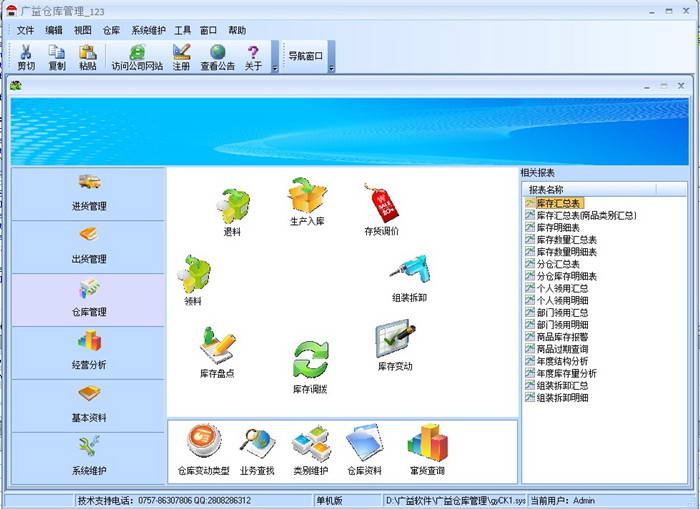 广益仓库管理主要分为采购管理,销售管理,仓库管理,基本资料,系统设置(权限管理)六大部分。主要以仓库为核心。主要功能包括: