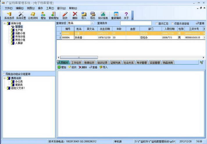 广益电子档案管理系统主要分为基本信息维护、员工照片、工作经历、教育经历、培训记录、证书列表、工资调整、社会关系、职称评定、考评管理、奖惩管理、物品领用、系统维护、自定义排序,重新编码等功能点,全面支持图片扫描模式。