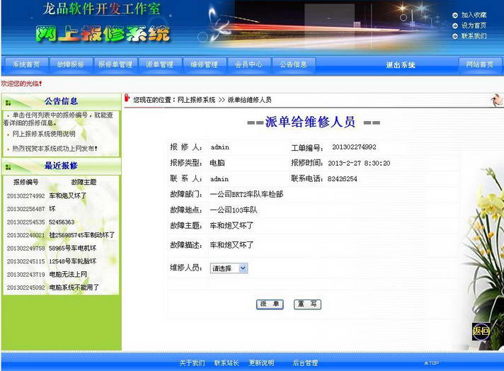 ⒉分类管理:包括未派单、未受理、未完成、已完成四类。显示每一类的报修信息及总数。并实现与前台一样的操作。