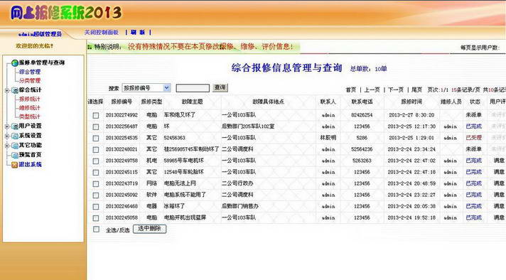 ⒈综合管理:可以查询各类报修信息,可删除或批量删除报修信息,可修改全部报修和维修信息。新增有条件生成Excel文件功能。