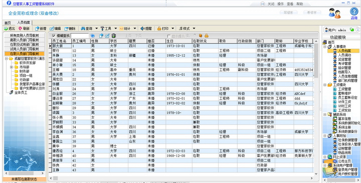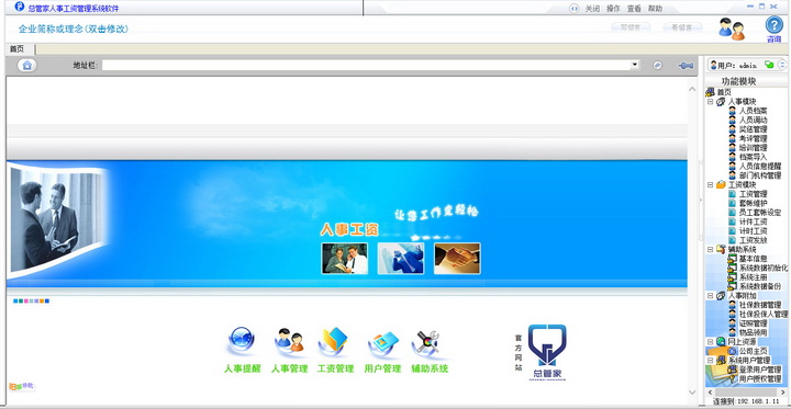 总管家人事工资管理系统(原大管家人事工资管理系统),企业人力资源管理的好帮手,10年畅销,众多用户、屡获殊荣、深得好评,图形导航界面、功能强大、通用性强、操作简单、容易上手。适合于各机关、企事业单位、工厂、学校等使用。 人事管理系统:完善的人事档案管理, 支持员工照片、人员增加、调动。支持工作经历管理、社会关系管理、职工培训管理、奖惩管理、证照管理等,人事项目自定义。强大统计报表、图形分析、支持人事数据Excel导入、导出功能、提供人事系统工作提醒功能:生日提醒、合同到期提醒、试用期到期提醒。支持员工表格列自定义。多种人员档案样式打印 、还支持工作证、出工卡打印等。值得您选择的人事软件产品。 工资管理系统:支持多帐套管理工资,完全自定义工资项目及计算公式,支持个税自动计算,管理员工等级工资、工龄工资,生日补贴,工资批量初始化,计时、计件工资,支持计时、计件工资导入导出,打印工资单、工资条、银行签领单,生成员工个人汇总表、部门工资台帐、个人工资台帐,银行转帐盘等,支持excel导入导出工资数据,可实现分支机构统发工资,工资管理不再琐碎复杂;操作简单的工资软件将帮助您建立自己的工资系统。系统提供数据备份,恢复工具,可选择初始化部分数据,使用更方便、数据更安全;有单机版和网络版C/S(客户/服务模式)分为服务端和客户端,支持局域网、互联网,让人事工资管理工作变轻松! 多个版本,适合不同功能需求,给您的人事工资管理更多选择。 *完善的人事管理,便捷的录入,打印档案表,员工照片; *人员批量调动,人员结构分析,人员增、减统计; *人员奖惩、考评、培训管理等等; *支持人员档案数据外部导入; *多功能,适应面广的工资管理,工资批量初始化; *多种录入,方便快捷:卡片式工资录入或表格式录入工资; *支持工资多套帐,自定义工资项目明细及其计算公式; *支持个人所得税计算,计时、计件工资等管理; *打印工资单、工资条,自定义工资表头项目; *部门、员工工资年报等等; *基本信息设计:用户可以自定义部门、职务、职称等多种信息,实用性更强,使用更加灵活; *数据工资:轻松备份、恢复、压缩数据; *用户管理:多用户,分级授权,互不干扰,轻松网络办公; *超强的组合查询,即可获得您需要的特定信息; *强大的统计分析、报表打印、数据导入、导出功能; *还提供用户自定义数据导出格式,生成银行转账盘; *打印出工卡,工作证(中文、英文),工龄多种核算 *界面友好,图形导航帮您轻松上手; *首次使用只需“上手三部曲”; *系统预制了大量演示数据帮您快速掌握,工作得心应手; *总管家管家将助您轻轻松松做好人事工资管理工作。 内置演示数据,详细帮助,客服信息,以及我司网站有多媒体教学演示,让您工作无忧!