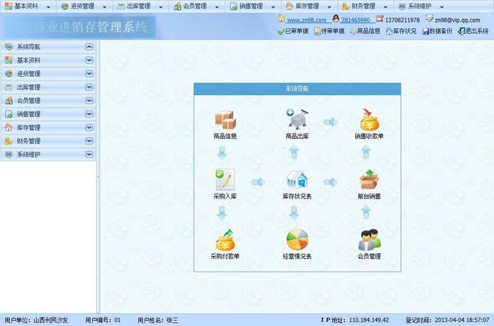6、软件整合了零售收银、批发、采购、仓库、财务、人事、商品管理、查询与报表、系统维护等功能,协助您经营管理。