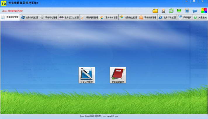 该系统主要管理设备的相关信息,依次分为设备前期管理,设备档案管理。设备动态管理。设备点检管理,设备维修管理,设备保养管理,设备备件管理,设备综合管理,系统维护,关于系统这些功能部分。