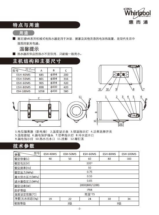 惠而浦ESH-50MS热水器使用安装说明书