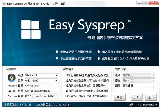 Easy Sysprep是一款用于 Windows 操作系统系统部署专业工具,使用人群主要是企业的系统工程师和系统技术爱好者,与 [自由天空综合驱动包] 结合成整套成熟可靠系统部署解决方案,这套解决方案可以提高 Windows 的部署效率,降低技术成本。只支持 Windows XP x86 简体中文版,但不要担心,即便是只具备30%功能的ES4,针对经典的XP系统的驾驭能力已超过ES3,所以如果只用封装XP系统的话还是非常足够的,在ES3.1 Beta中对其进行一些调整。有些修正会带来新的兼容性,例如对更新主板磁盘控制器的兼容(如:INTEL P67/H67等)、对新软件程序的兼容(如:e驱动v5等);而有些修正亦会带来未可知的负面效应,如对SRS驱动的调整、对个别代码执行方式的新尝试等。简而言之,新版本可能带来新的功能,亦可能带来新的问题。Easy Sysprep 以微软系统准备工具 sysprep.exe 程序为核心,以微软官方文档为理论依据,结合广大系统工程师、系统维护人员、系统爱好者的实战经验,将系统封装的各步骤进行有机的整合。Easy Sysprep 有如其名,力求将复杂的 Windows 操作系统封装过程变得简单实用。