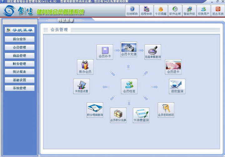 创生健身会员管理系统是专门为健身会所、会馆等行业打造的集会员管理系统、会员储值卡系统、会员卡管理系统、会员消费卡系统、会员储值积分系统、会员营销、会员积分卡系统、会员折扣、商品销售、商品库存管理于一体的综合性会员管理系统服务平台。采用分店向总店自动传送营业数据,同时可以实现各个店会员资料的共享。能够充分满足集团型和连锁型企业会员管理需要。实现总店实时查看各分店营业数据功能。实现所有分店会员储值积分卡实时联网功能。