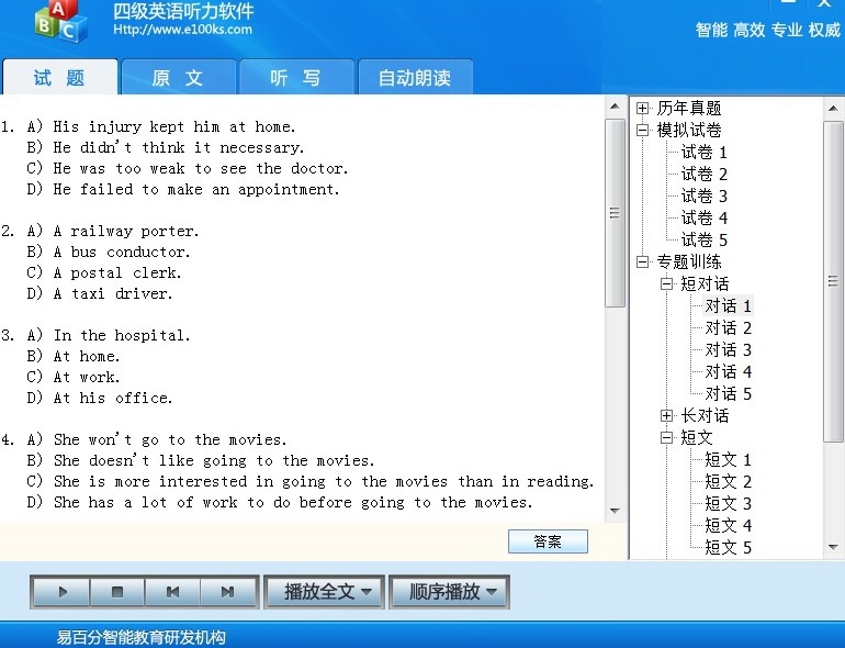 1楼 华军网友 2018-12-10 08:42:49易百分听力软件---四级听力试听版很好用,谢谢啦!!