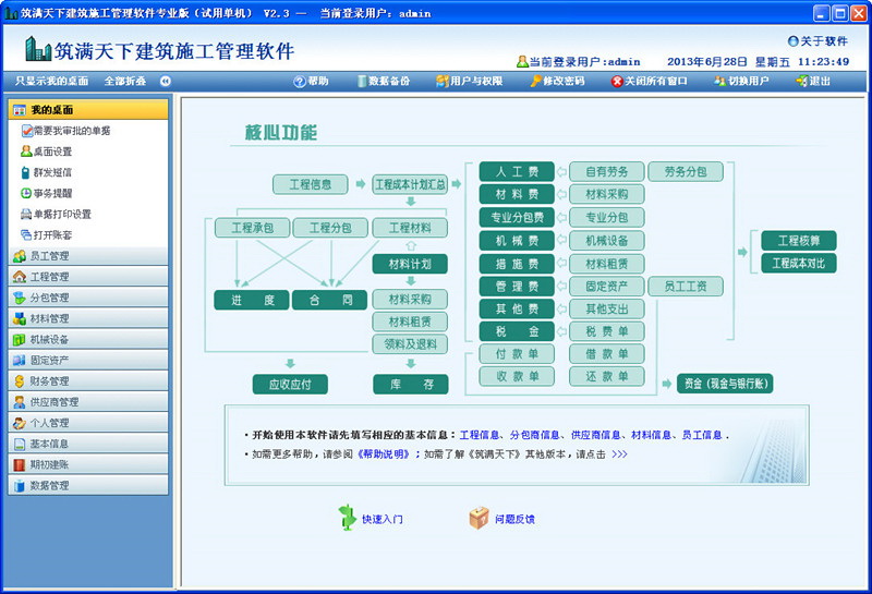 筑满天下建筑施工管理软件是北京数洲科技在吸收国内外先进管理思想,结合我国施工企业实际情况的前提下,基于本公司先进的XMCore平台技术开发而成的一套专业软件。本软件包含了对人、材、机、资金等生产要素的管理,可以就施工企业最关心的成本、资金、合同、进度、分包、材料等环节进行实时跟踪与控制,是施工企业实现信息化管理的最佳解决方案。