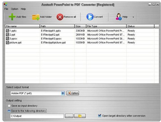 2楼 华军网友 2014-08-19 02:56:26Aostsoft PowerPoint to PDF Converter整体感觉不错,还是挺满意的,安装运行很流畅!按照安装步骤指导来非常顺利!