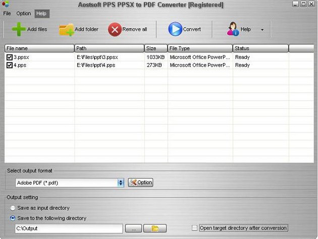 1楼 华军网友 2013-12-03 01:48:03Aostsoft PPS PPSX to PDF Converter很好用,谢谢啦!!