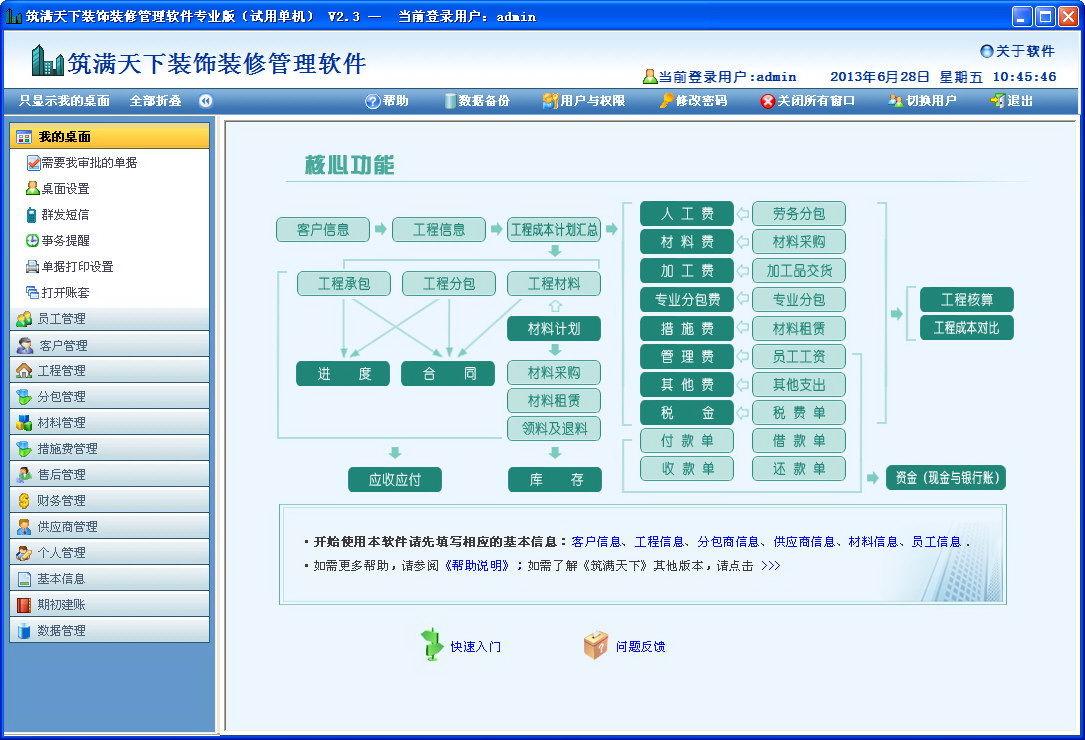本软件面向的用户群体:工程建筑、安装、装修企业的管理人员、行政人员、财务人员等。