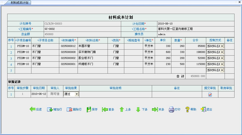 1、全面的工程成本管理。其中成本计划包括材料成本计划、人工成本计划、分包成本计划、加工成本计划、措施费成本计划、管理费成本计划以及工程成本计划汇总,以上各项计划都可以进行成本控制设置,并且材料成本计划还可以按材料名称、按规格型号进行材料成本控制。