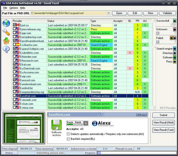 3楼 华军网友 2009-12-04 15:33:39GSA Auto SoftSubmit整体感觉不错,还是挺满意的,安装运行很流畅!按照安装步骤指导来非常顺利!