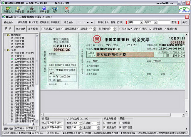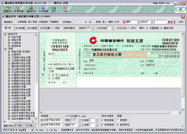 魔法师支票票据打印软件系统用于各类支票打印、进帐单打印、电汇凭证打印、现金交款单打印和业务委托书与业务申请书打印,帮助财务人员减轻日常票据填写工作,并有效避免填写错误。本打印软件是一款具备全自主创建模板、 全自主排版、全自主定义打印项目,并拥有强大的数据导入与数据整理功能的专业支票票据打印软件。软件的全自主特色让使用者不需依赖开发商就可简单、快速、独立创建各种打印模板,使其想打什么就打什么,想怎么打就怎么打。